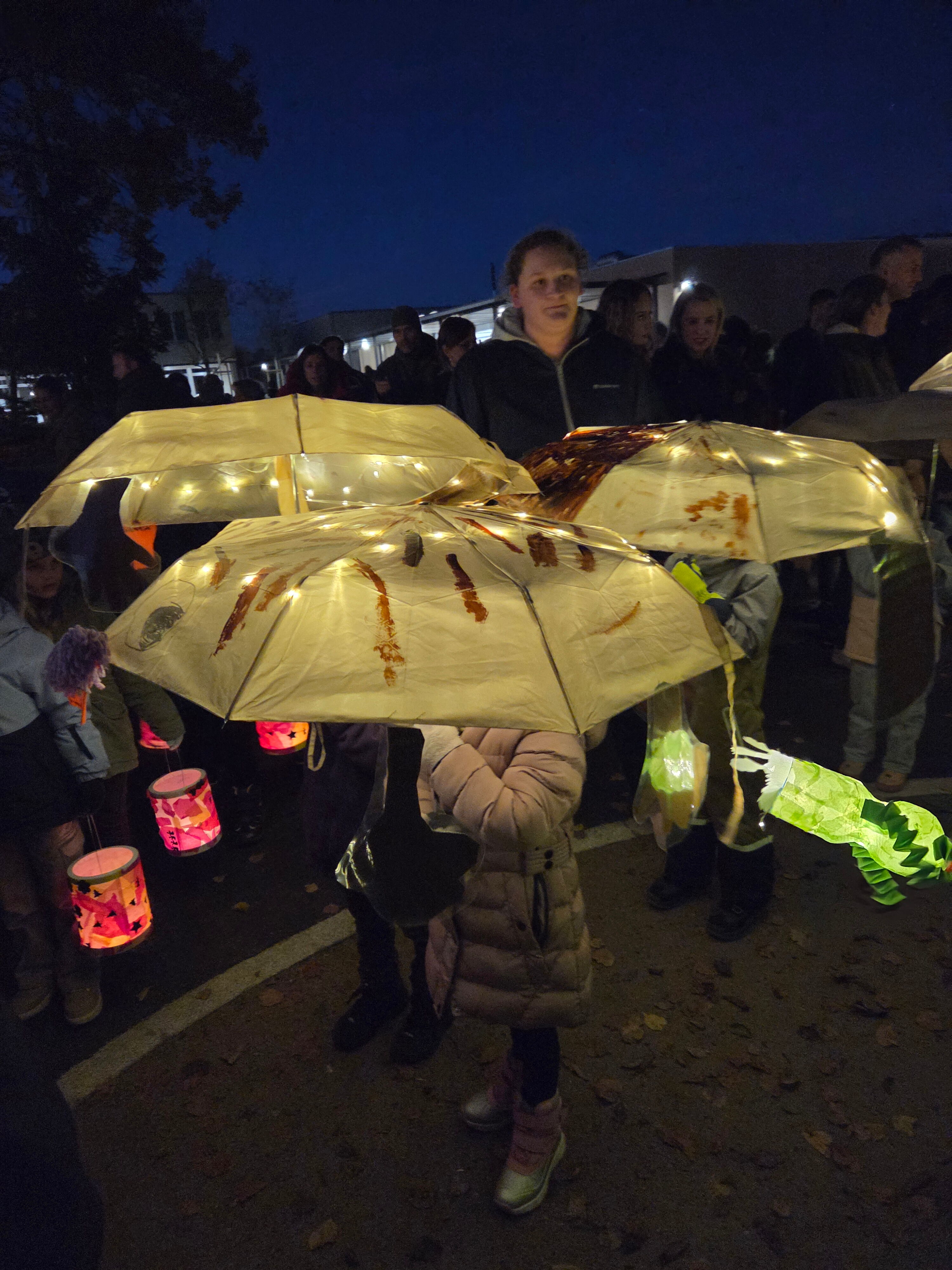Der Umzug wurde von den Tambouren aus Brugg-Windisch angeführt. Mit ihren leuchtenden Drumsticks sorgten sie für einen besonderen Blickfang und führten unsere Schülerinnen und Schüler, sicher durch die dunkle Nacht. Die Kinder zeigten stolz ihre bunt gestalteten Räbeliechtli, Laternen und liebevoll geschmückten Wagen. Unser neuer Schulbrunnen wurde dekoriert und stimmungsvoll in Szene gesetzt. Die hell leuchtenden Laternen und Räben erhellten die klare Herbstnacht auf wunderbare Weise. Die Kinder waren so begeistert von diesem magischen Moment, dass sie beim Zurückkehren zum Schulhausplatz voller Freude fragten: „Warum ist der Umzug schon vorbei?“ – ein wunderbares Zeichen dafür, wie sehr sie den Abend genossen haben.