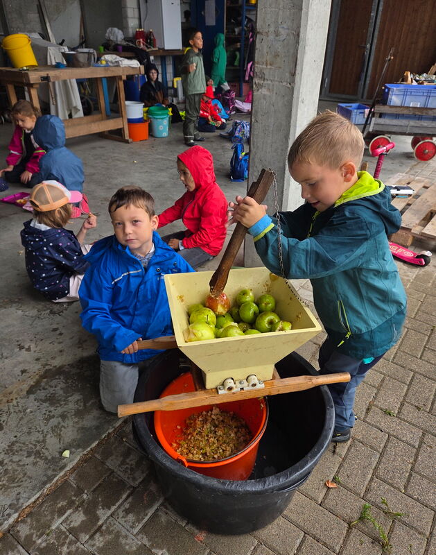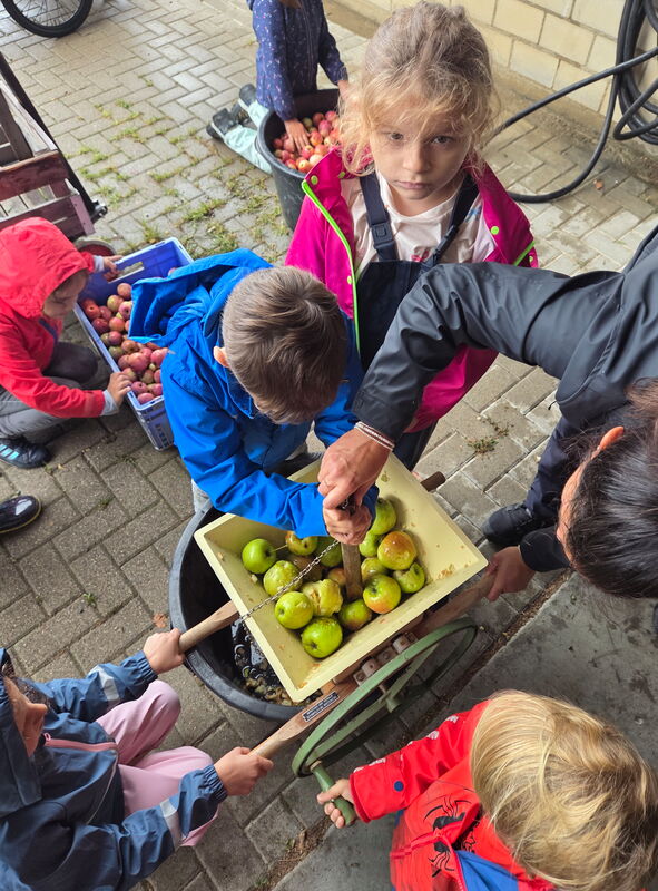 Beim Zusammenarbeiten lernten sich Kinder und Lehrpersonen besser kennen und alle freuten sich, als sie den feinen selbstgepressten Apfelsaft probieren durften. Manchen schmeckte er so gut, dass der Bauch etwas knurrte…