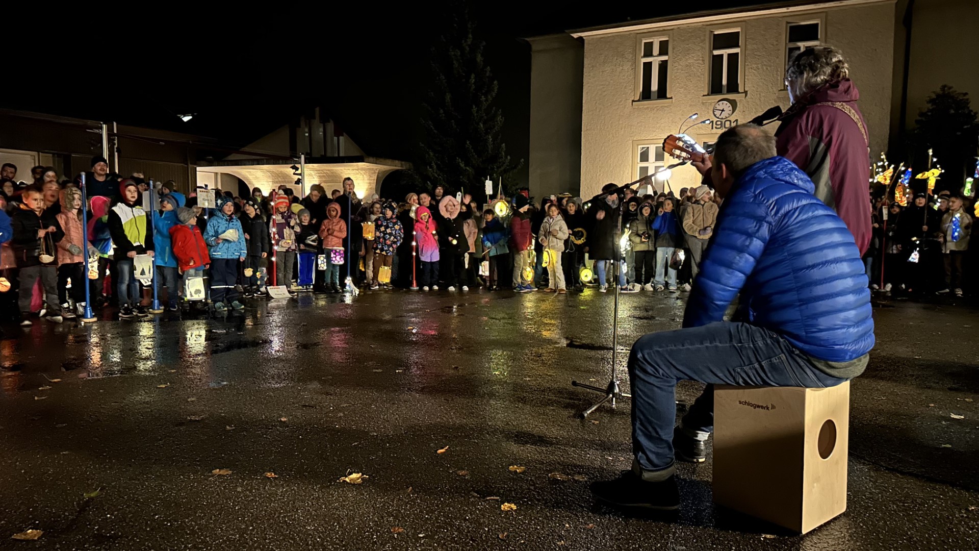 Im Schulhof angekommen, genossen alle das stimmungsvolle Beisammensein. Schulleiterin Sybille Lüscher und Gemeindeammann Patrick Gosteli dankten den vielen Helferinnen und Helfern. Zum Abschluss lud ein reichhaltiges Buffet mit allerlei Köstlichkeiten zum Verweilen ein – ein gelungener Herbstabend voller Lichterglanz und gemeinsamer Freude.