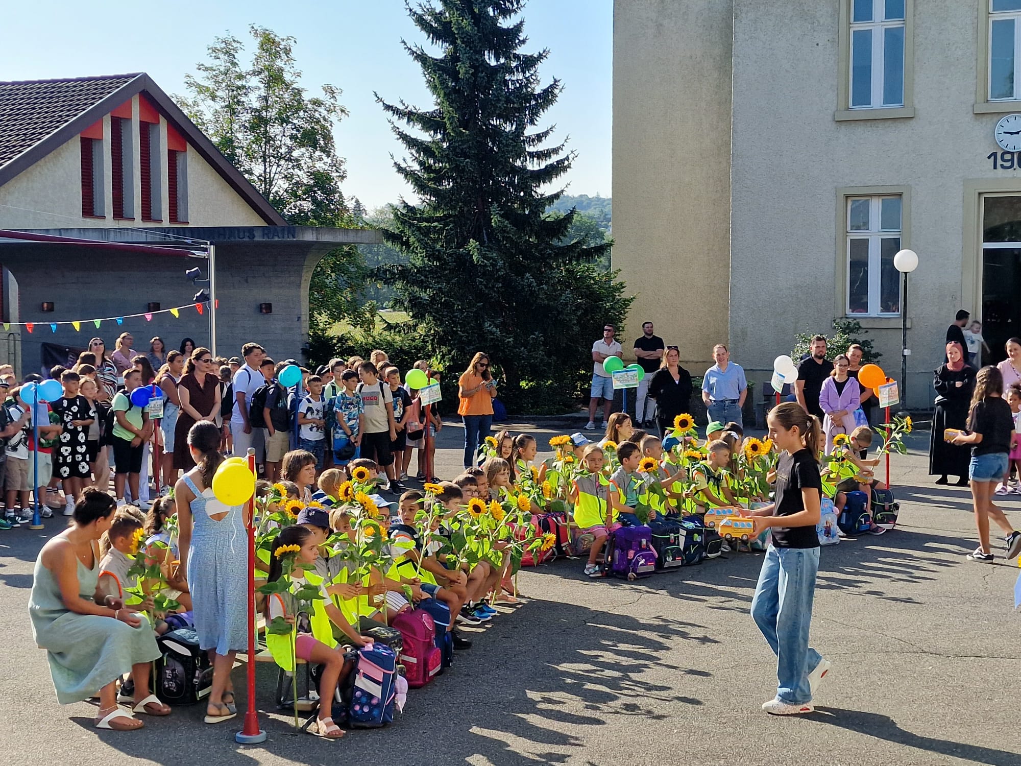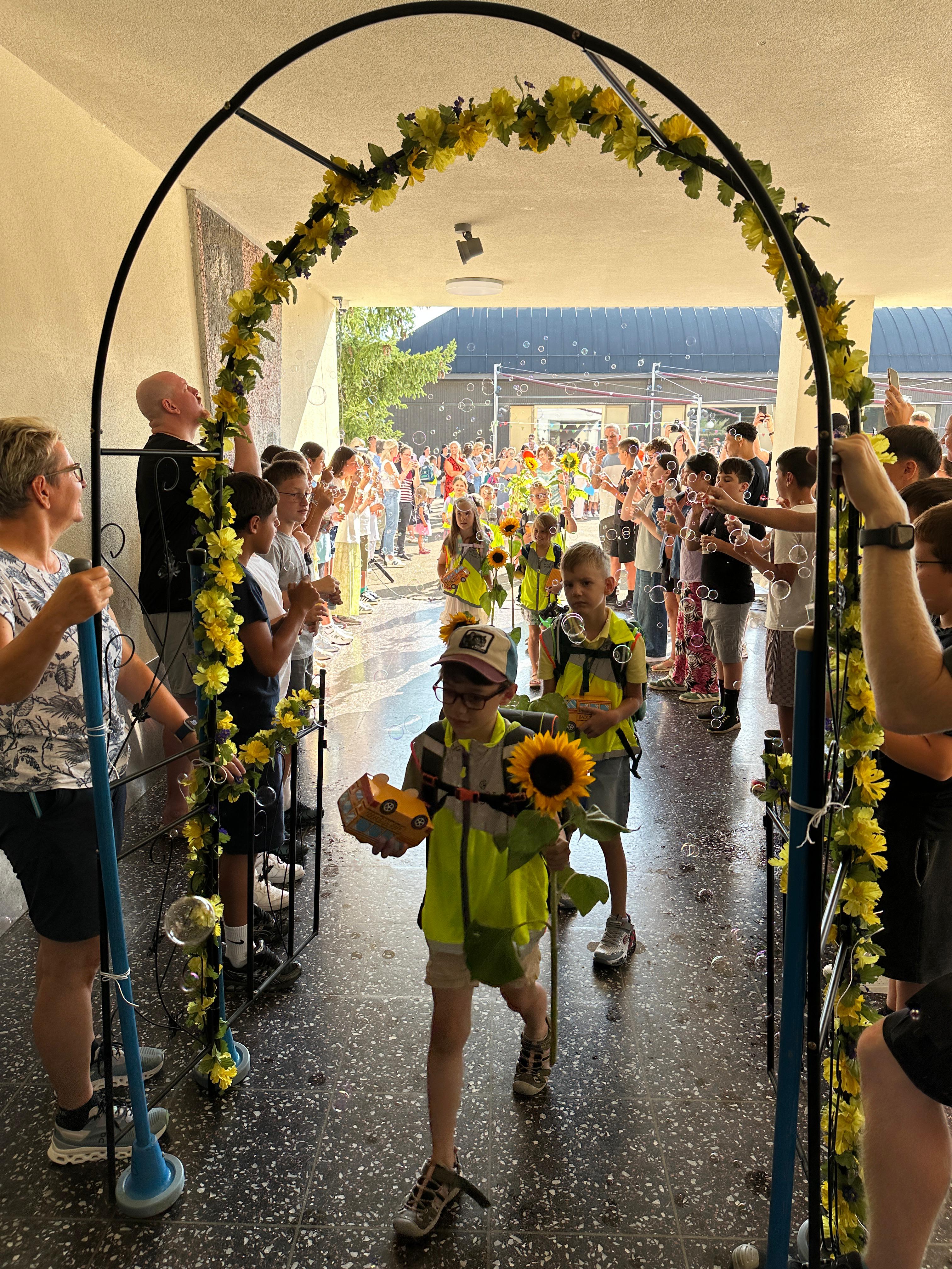 Besonders unsere Erstklässler standen im Mittelpunkt: Stolz und aufgeregt machten sie ihren ersten grossen Schritt in die Primarschulfamilie. Zur Begrüssung überreichte ihnen ihre Klassenlehrperson eine Sonnenblume – ein Zeichen für Wachstum. Doch damit nicht genug: Unsere erfahrenen Sechstklässler überraschten die Jüngsten mit einem liebevoll gestalteten Mini-Schulbus, gefüllt mit praktischen Schulutensilien. Der Einzug der Erstklässler in das Schulhaus Rain 1, durch ein schillerndes Spalier aus Seifenblasen sorgte für einen magischen Moment.