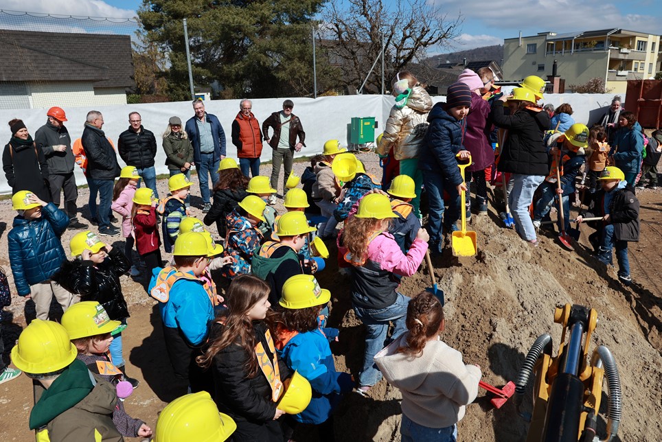 Am 27. März 2025 feierten rund 130 Kinder und Lehrpersonen bei strahlendem Sonnenschein den offiziellen Spatenstich für den neuen Fünffach-Kindergarten in Rain. Gemeindeammann Patrick Gosteli betonte die Bedeutung des neuen Kindergartens als wichtigen Lern- und Begegnungsort.