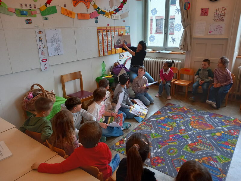 Die älteren Kinder lasen zu Beginn die liebevoll erzählte Geschichte vom kleinen Nilpferd vor, das unbedingt alles genauso machen wollte wie sein Vater — einkaufen mit Karte, sich rasieren und Kaffee trinken. Die Kindergartenkinder hörten aufmerksam zu und liessen sich von den Bildern und dem Humor der Geschichte mitziehen. Das Vorlesen förderte Sprachverständnis, Zuhörkompetenz und die Vorbildrolle der älteren Schülerinnen und Schüler.