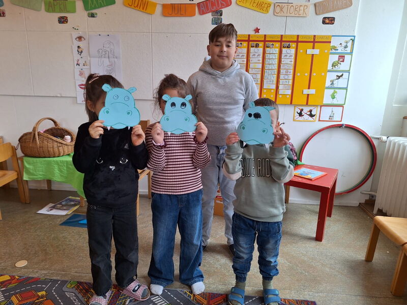 Zum Abschluss setzten sich alle kreativ mit dem Thema auseinander und gestalteten gemeinsam Nilpferdmasken. Mit Geduld, Geschick und Fantasie entstanden originelle Werke. Die Viertklässler übernahmen fürsorgliche Unterstützungsrollen beim Schneiden und Kleben, liessen den Kindergartenkindern gleichzeitig genügend Freiraum, um eigene Entscheidungen zu treffen.