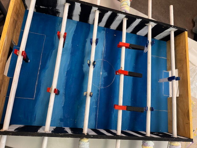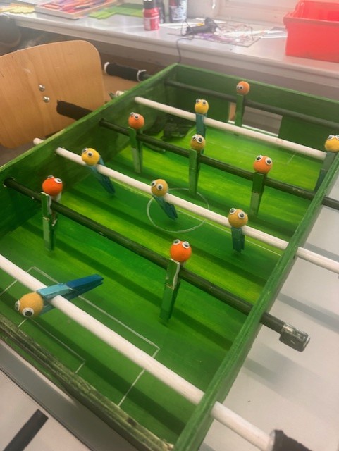 Jedes Bauteil entsteht in Teamarbeit: Vom stabilen Holzrahmen über die weissen Spielstangen bis hin zum blau bemalten Spielfeld mit fein gezogenen Linien — alles wurde von den Schülerinnen und Schülern gefertigt, bemalt und montiert. Besonders eindrücklich ist das Zusammenspiel: Während ein Kind an der Maschine arbeitet, beobachten und unterstützen die anderen, tauschen Ideen aus und planen die nächsten Schritte. So verschmelzen technisches Verständnis, handwerkliches Geschick und kreative Gestaltung zu einem echten, gebrauchsfertigen Produkt.