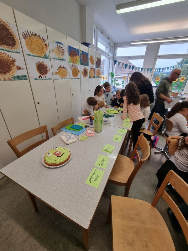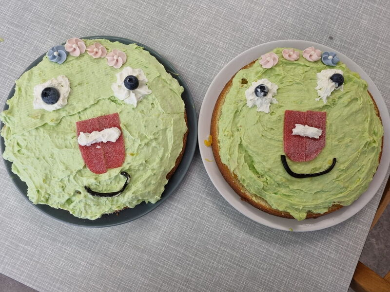 Für die Beantwortung der zweiten Frage muss etwas mehr ausgeholt werden. Die Erstklässler arbeiten viel mit dem «kleinen Wir», einem haarigen, grünen Wesen das für die Freundschaft und den Teamgeist steht. Die Schulsozialarbeit hat das zum Anlass genommen um mit den Schülern zu thematisieren, welche «Zutaten» eine richtige Freundschaft hat. Die Zutaten zum Kuchen wurden dann mit den Zutaten zur Freundschaft benannt. Und so entstand ein leckerer, grüner Kuchen auf einem «Team-Biskuitboden» und unter Einsatz von viel «gemeinsame Hobbies Rahm» und mit «Aufmerksamkeitsgrüner Lebensmittelfarbe». Zum Gesicht vom «kleinen Wir» verziert wurde der fertige Kuchen dann mit «Teilen-Heidelbeeren», «Geschenk-sauren Zungen» und «Zusammen spielen Lakritz». Der Benennung der Zutaten sind dabei keine Grenzen gesetzt. Das Rezept für den Freundschaftskuchen finden Sie direkt weiter unten zum Download.