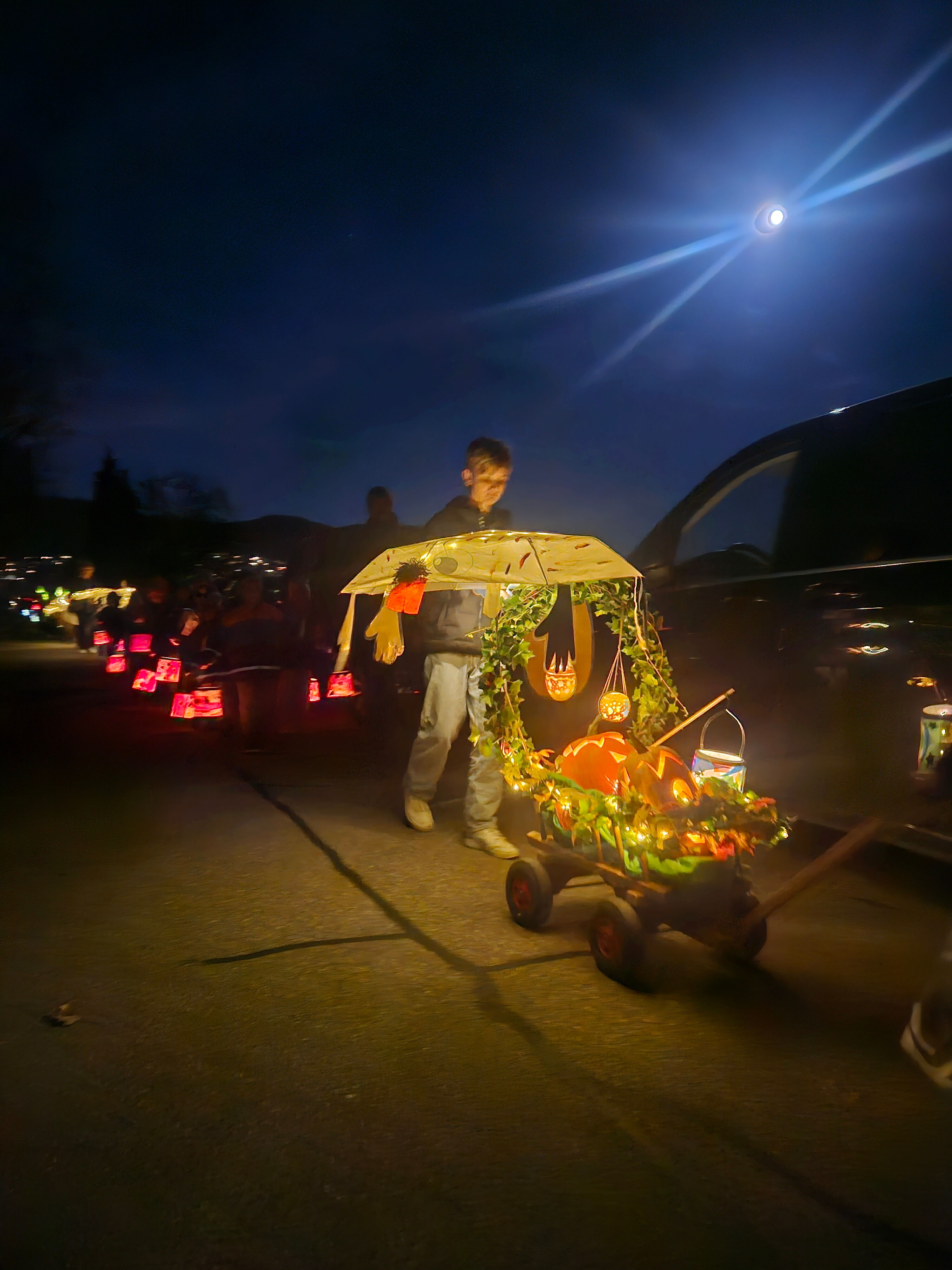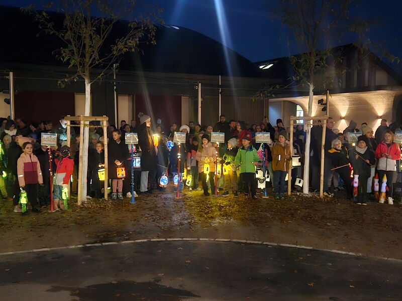 Der Umzug wurde von den Tambouren aus Brugg-Windisch angeführt. Mit ihren leuchtenden Drumsticks sorgten sie für einen besonderen Blickfang und führten unsere Schülerinnen und Schüler, sicher durch die dunkle Nacht. Die Kinder zeigten stolz ihre bunt gestalteten Räbeliechtli, Laternen und liebevoll geschmückten Wagen. Unser neuer Schulbrunnen wurde dekoriert und stimmungsvoll in Szene gesetzt. Die hell leuchtenden Laternen und Räben erhellten die klare Herbstnacht auf wunderbare Weise. Die Kinder waren so begeistert von diesem magischen Moment, dass sie beim Zurückkehren zum Schulhausplatz voller Freude fragten: „Warum ist der Umzug schon vorbei?“ – ein wunderbares Zeichen dafür, wie sehr sie den Abend genossen haben.